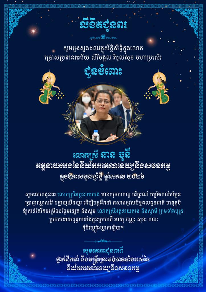 លិខិតជូនពរ សូមគោរពជូន លោកស្រី នាន បូនី អគ្គនាយករង នៃនិយ័តករគណនេយ្យនិងសវនកម្ម និងស្វាមី ព្រមទាំងបុត្រ ក្នុងឱកាសចូលឆ្នាំថ្មី ឆ្នាំសកល ២០២៦