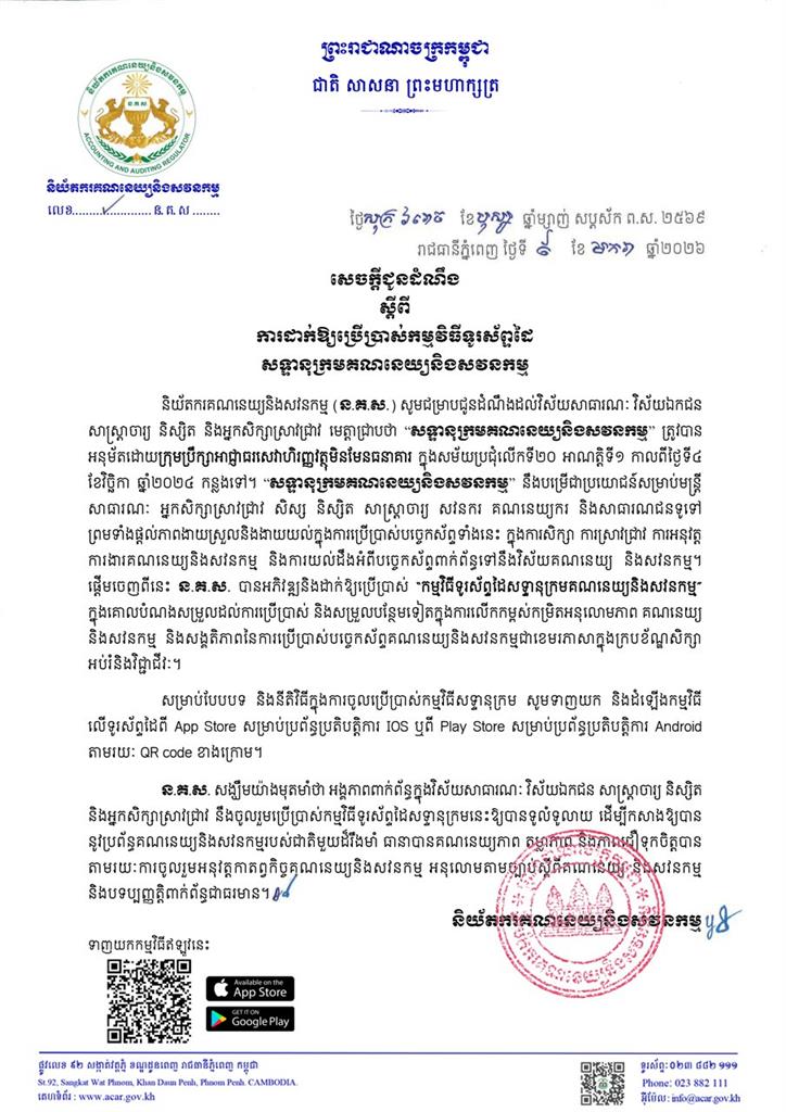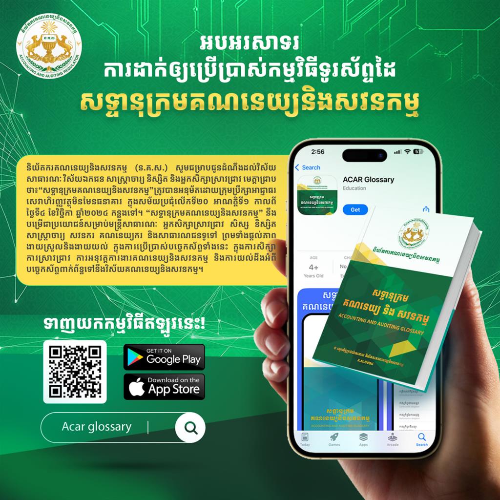 សេចក្តីជូនដំណឹង ស្តីពី ការដាក់ឱ្យប្រើប្រាស់កម្មវិធីទូរសព័្ទដៃ សទ្ទានុក្រមគណនេយ្យនិងសវនកម្ម
