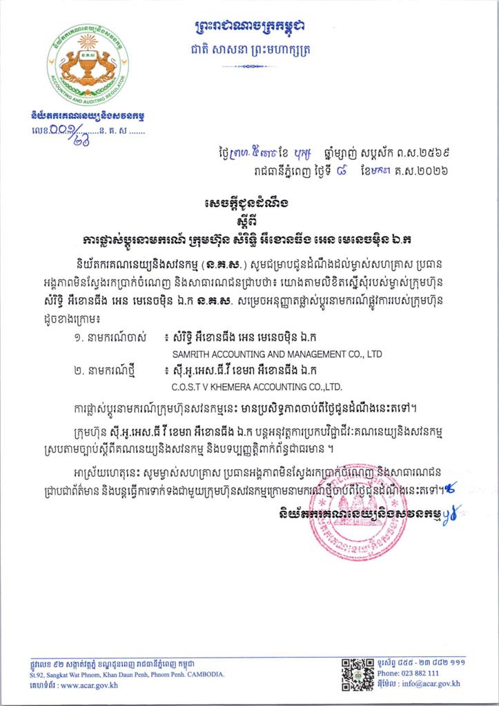 សេចក្តីជូនដំណឹងស្តីពី ការផ្លាស់ប្តូរនាមករណ៍ ក្រុមហ៊ុន សំរិទ្ធិ អឹខោនធីង អេន មេនេចម៉ិន ឯ.ក