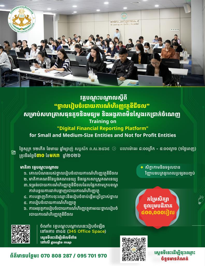 វគ្គបណ្តុះបណ្តាលស្តីពី “ថ្នាលរៀបចំរបាយការណ៍ហិរញ្ញវត្ថុឌីជីថល” សម្រាប់សហគ្រាសធុនតូចនិងមធ្យម និងអង្គភាពមិនស្វែងរកប្រាក់ចំណេញ
