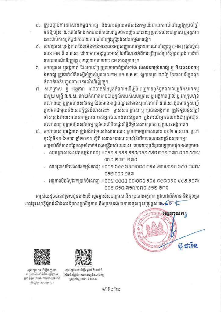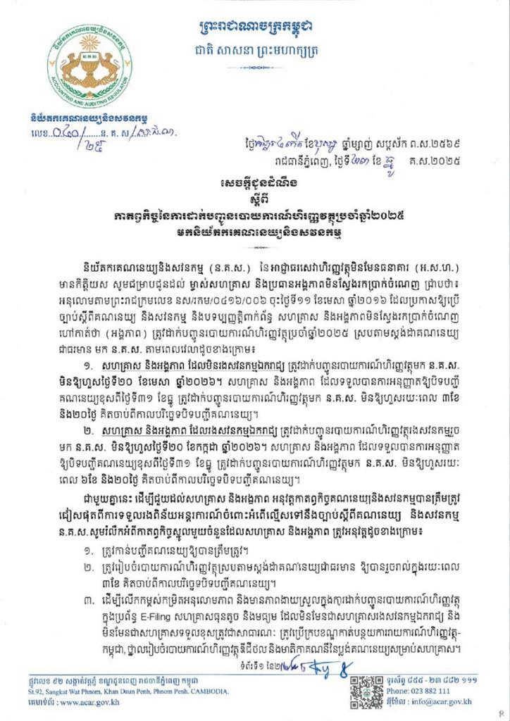 សេចក្តីជូនដំណឹង ស្តីពី កាតព្វកិច្ចនៃការដាក់បញ្ជូនរបាយការណ៍ហិរញ្ញវត្ថុប្រចាំឆ្នាំ២០២៥ មកនិយ័តករគណនេយ្យនិងសវនកម្ម