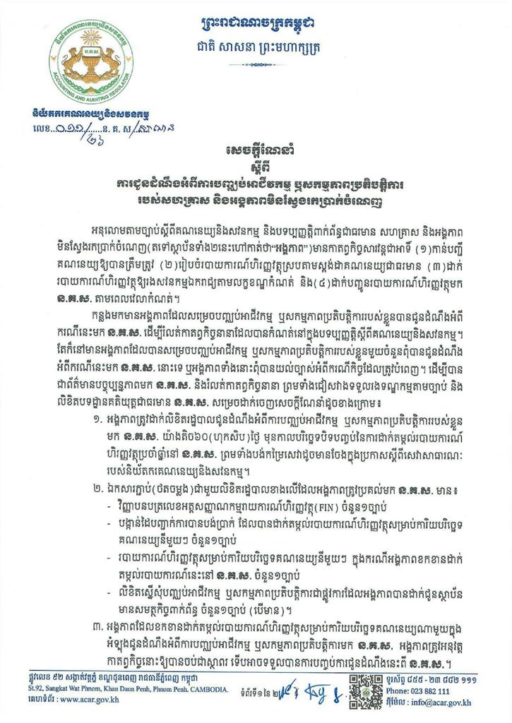 ពាក្យស្នើសុំបដិប្បញ្ញត្តិដាក់របាយការណ៍ហិរញ្ញវត្ថុឱ្យរងសវនកម្មឯករាជ្យ