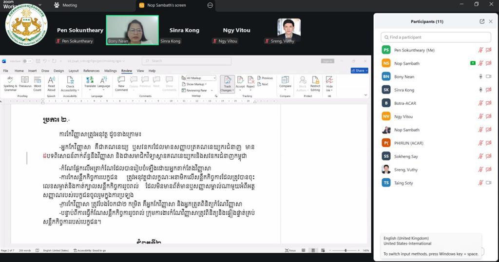 នាព្រឹកថ្ងៃព្រហស្បតិ៍ ៩រោច ខែផល្គុន ឆ្នាំម្សាញ់ សប្តស័ក ព.ស. ២៥៦៩ ត្រូវនឹងថ្ងៃទី១២ ខែមីនា គ.ស. ២០២៦ វេលាម៉ោង ២:០០នាទីរសៀល តាមប្រព័ន្ធអនឡាញ (Zoom) លោកស្រី នាន បូនី អគ្គនាយករងនៃនិយ័តករគណនេយ្យ និងសវនកម្ម និងជាប្រធានអនុគណៈកម្មាធិការគ្រប់គ្រងការប្រឡង បានដឹកនាំ កិច្ចប្រជុំលើកទី៨ របស់អនុគណៈកម្មាធិការគ្រប់គ្រងការប្រឡង នៃគណៈកម្មាធិការគ្រប់គ្រងកម្មវិធីសិក្សាគណនេយ្យករជំនាញកម្ពុជា (គ.ក.គ.ក.) ដោយមានការអញ្ជើញចូលរួមពី លោកអនុប្រធាន សមាជិករបស់អនុគណៈកម្មាធិការគ្រប់គ្រងការប្រឡង និងលេខាធិការដ្ឋាន។