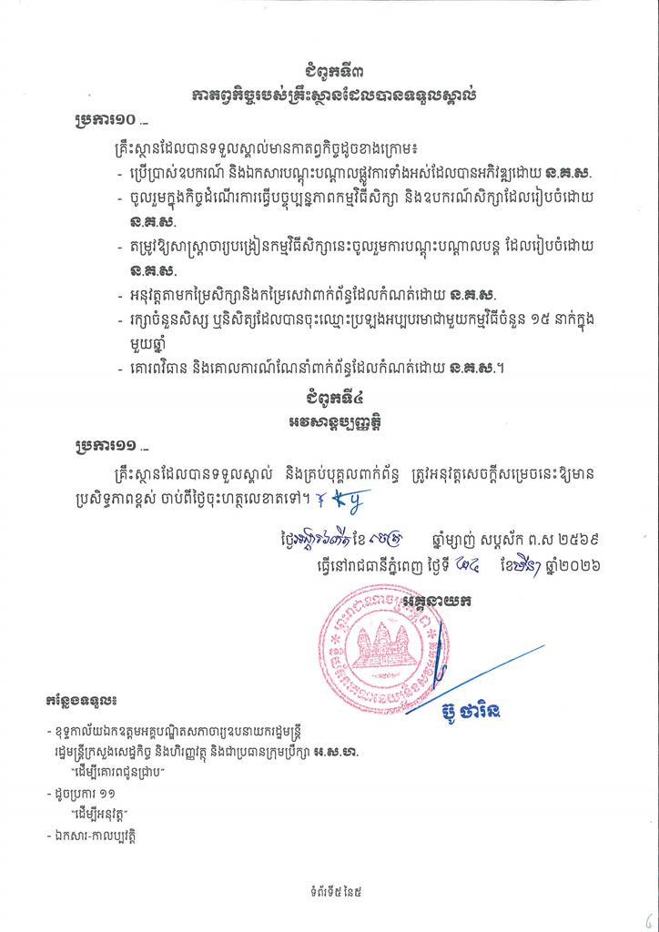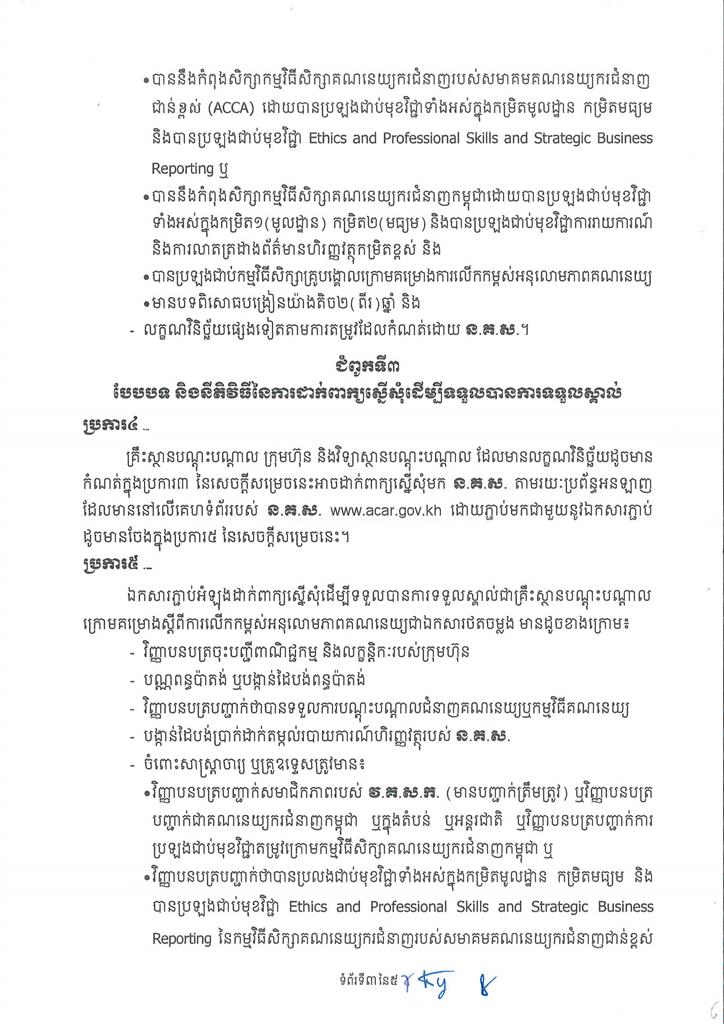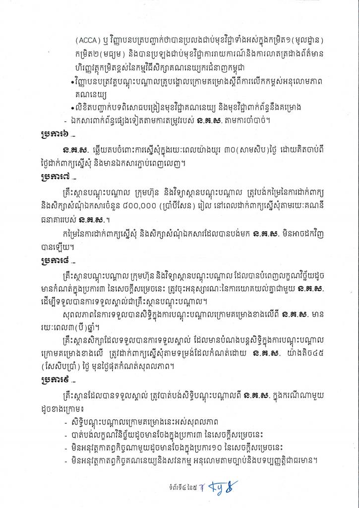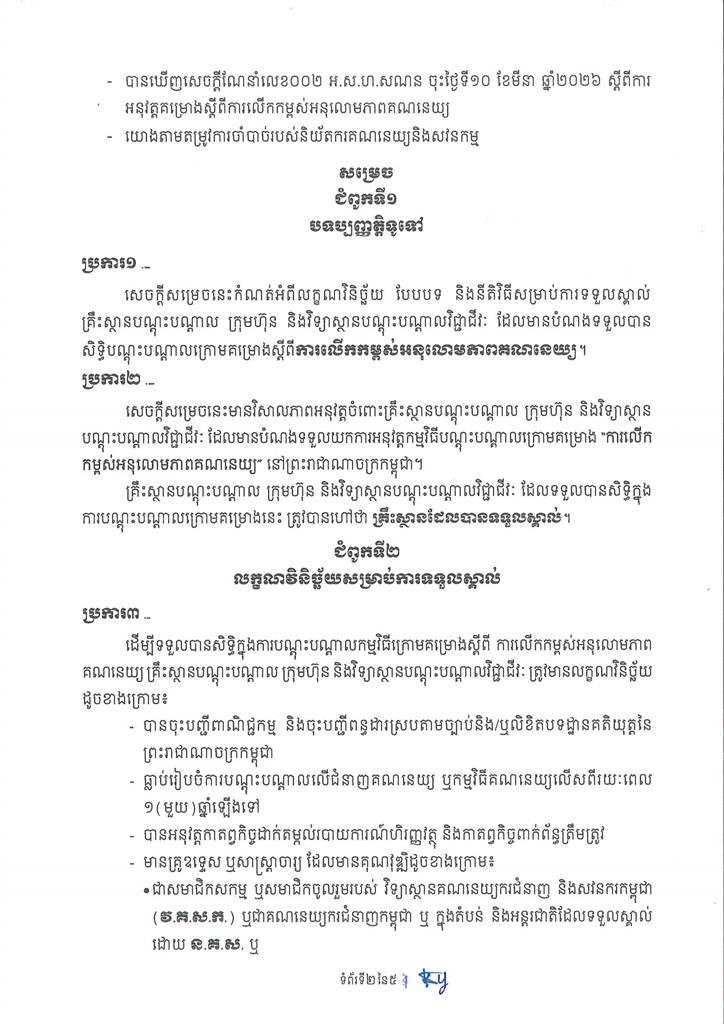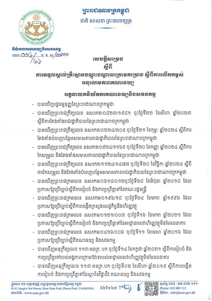 សេចក្តីសម្រេចស្តីពី ការទទួលស្គាល់គ្រឹះស្ថានបណ្តុះបណ្តាលក្រោមគម្រោង ស្តីពីការលើកកម្ពស់អនុលោមភាពគណនេយ្យ