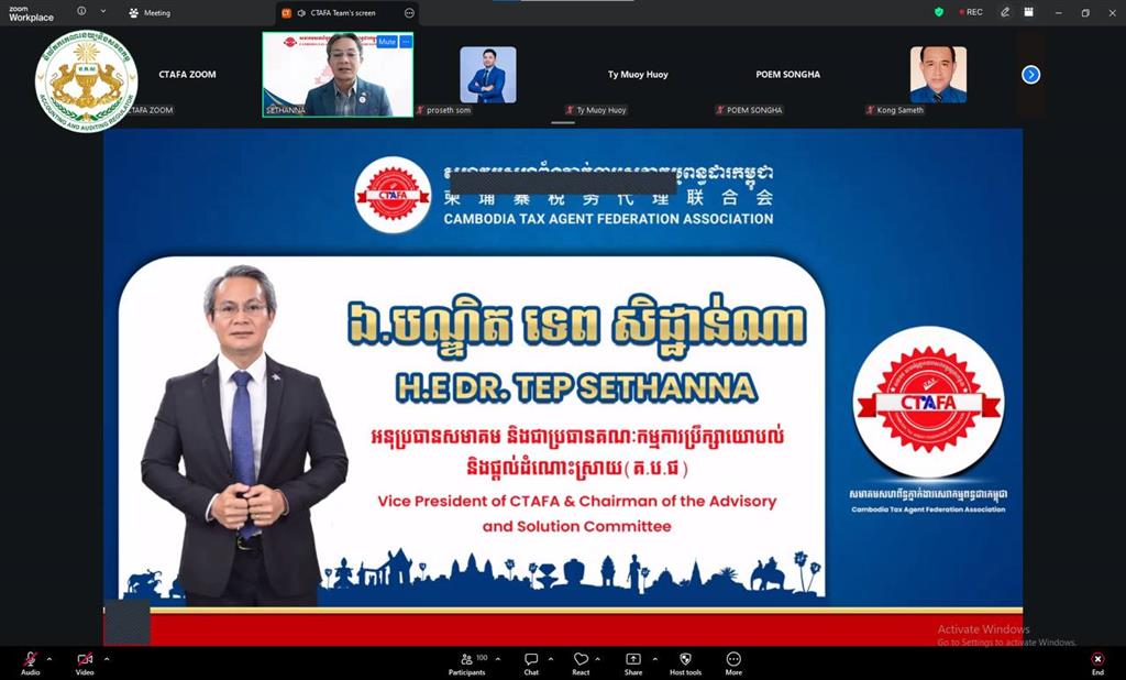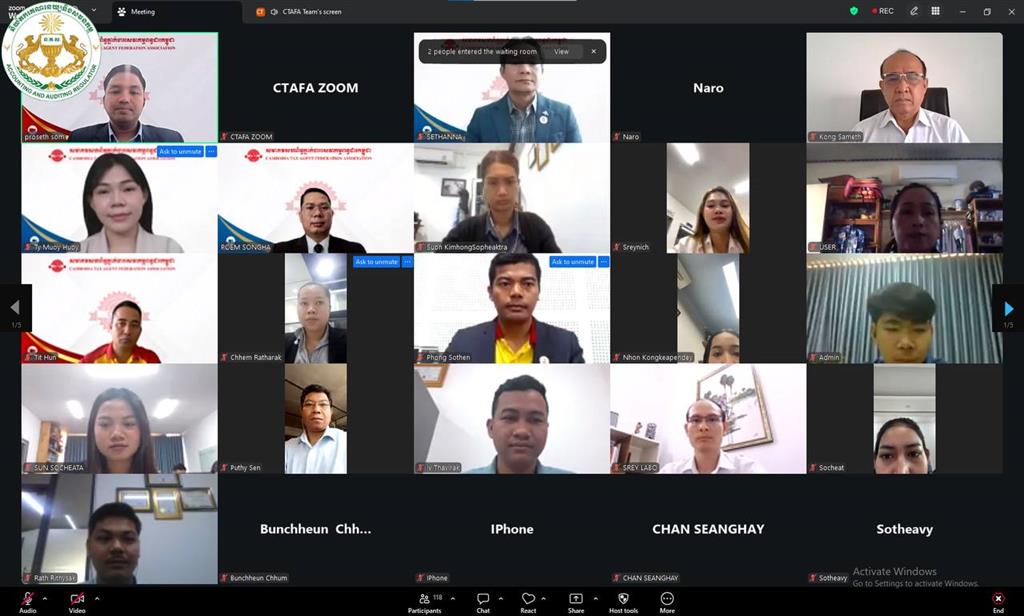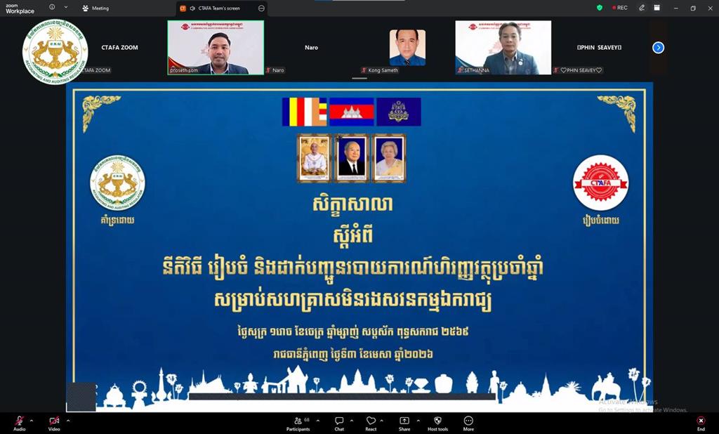 នាព្រឹកថ្ងៃសុក្រ ១រោច ខែចេត្រ ឆ្នាំម្សាញ់ សប្តស័ក ព.ស.២៥៦៩ ត្រូវនឹងថ្ងៃទី៣ ខែមេសា ឆ្នាំ២០២៦ ដោយទទួលបានការអនុញ្ញាតដ៏ខ្ពង់ខ្ពស់ពី ឯកឧត្តម ប៊ូ ថារិន អគ្គនាយកនៃនិយ័តករគណនេយ្យនិងសវនកម្ម លោកស្រី ទី មួយហួយ អនុប្រធានការិយាល័យអនុលោមភាពទី២ បានចូលរួមធ្វើបទបង្ហាញក្នុងសិក្ខាសាលាស្តីពី «នីតិវិធី រៀបចំ និងដាក់បញ្ជូនរបាយការណ៍ហិរញ្ញវត្ថុសម្រាប់សហគ្រាសមិនរងសវនកម្មឯករាជ្យ» ដែលរៀបចំឡើងដោយ សមាគមសហពន្ធ័ភ្នាក់ងារសេវាកម្មពន្ធដារកម្ពុជា (CTAFA) ក្រោមអធិបតីភាពដ៏ខ្ពង់ខ្ពស់របស់ ឯកឧត្តមបណ្ឌិត ទេព សិដ្ឋាន់ណា អនុប្រធានសមាគម និងជាប្រធានគណៈកម្មការប្រឹក្សាយោបល់និងផ្តល់ដំណោះស្រាយ នៃ CTAFA។ សិក្ខាសាលានេះក៏មានការអញ្ជើញចូលរួមពីម្ចាស់សហគ្រាស តំណាងសហគ្រាសដែលជាសមាជិករបស់សមាគម និងសិក្ខាកាមចំនួនប្រមាណ ២០០នាក់ តាមប្រព័ន្ធអនឡាញ (Zoom)។
