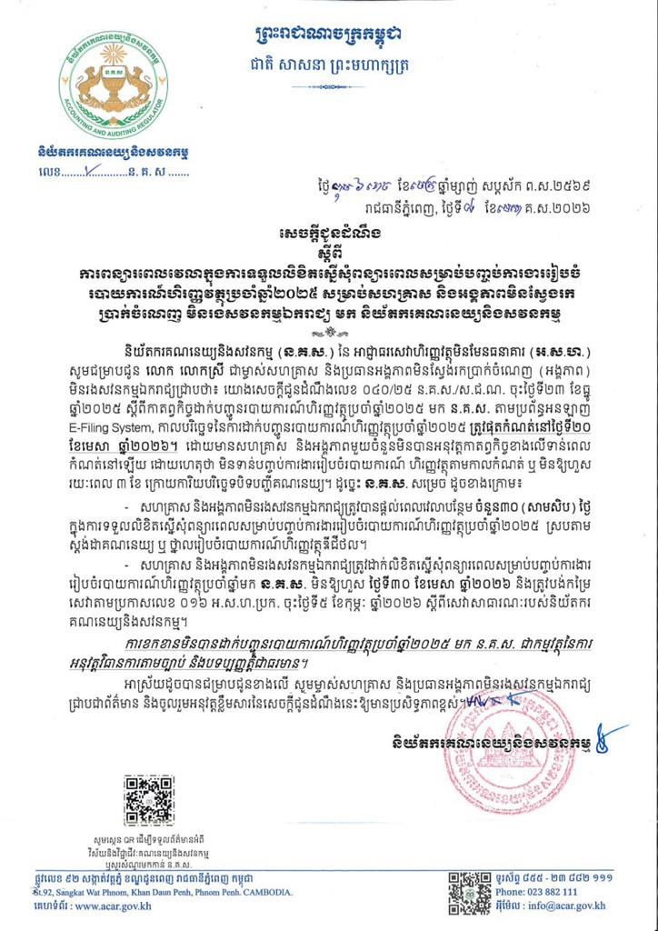 សេចក្តីជូនដំណឹង ស្តីពី ការពន្យារពេលវេលាក្នុងការទទួលលិខិតស្នើសុំពន្យារពេល សម្រាប់បញ្ចប់ការងាររៀបចំ របាយការណ៍ហិរញ្ញវត្ថុប្រចាំឆ្នាំ២០២៥