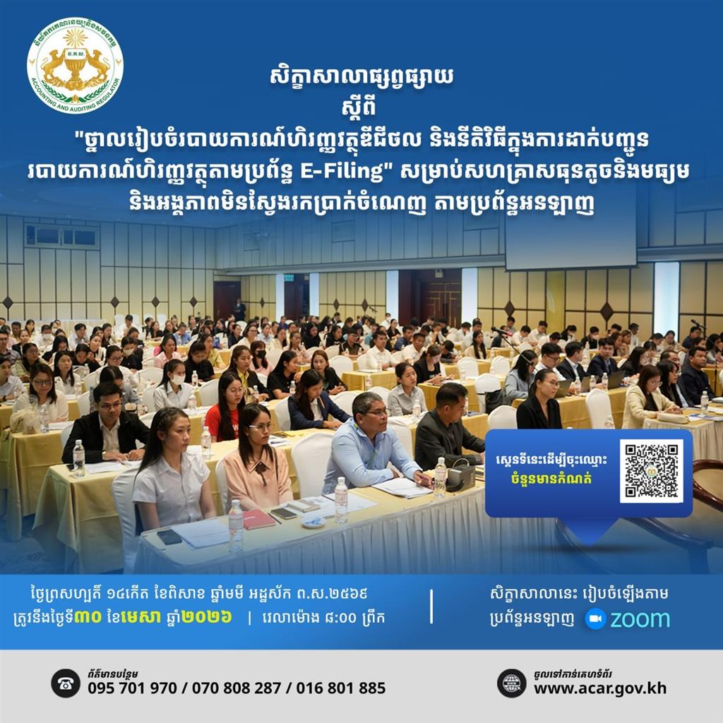 សិក្ខាសាលាផ្សព្វផ្សាយស្ដីពី "ថ្នាលរៀបចំរបាយការណ៍ហិរញ្ញវត្ថុឌីជីថល និងនីតិវិធីក្នុងការដាក់បញ្ជូនរបាយការណ៍ហិរញ្ញវត្ថុប្រចាំឆ្នាំតាមប្រព័ន្ធ E-Filing" សម្រាប់សហគ្រាសនិងអង្គភាពមិនស្វែងរកប្រាកចំណេញ តាមប្រព័ន្ធអនឡាញ (Zoom)