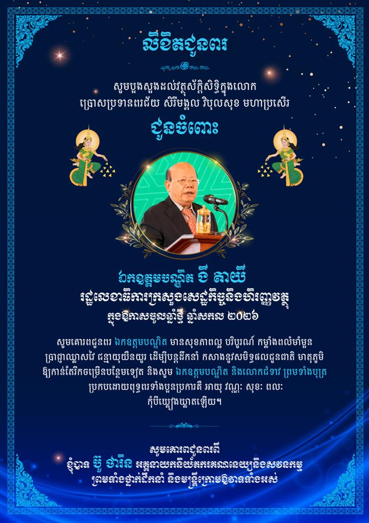 លិខិតជូនពរ សូមគោរពជូន ឯកឧត្ដមបណ្ឌិត ងី តាយី រដ្ឋលេខាធិការ ក្រសួងសេដ្ឋកិច្ចនិងហិរញ្ញវត្ថុ និងលោកជំទាវ ព្រមទាំងបុត្រ ក្នុងឱកាសចូលឆ្នាំថ្មី ឆ្នាំសកល ២០២៦