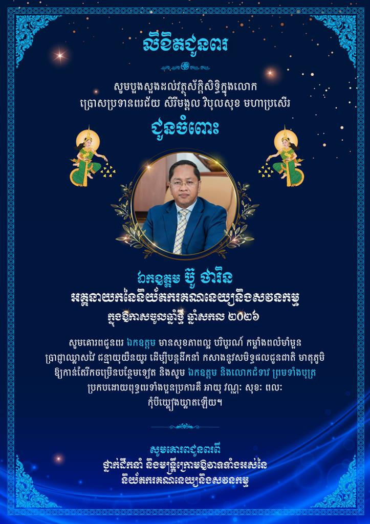លិខិតជូនពរ សូមគោរពជូន ឯកឧត្ដម ប៊ូ ថារិន អគ្គនាយក នៃនិយ័តករគណនេយ្យនិងសវនកម្ម និងលោកជំទាវ ព្រមទាំងបុត្រ ក្នុងឱកាសចូលឆ្នាំថ្មី ឆ្នាំសកល ២០២៦