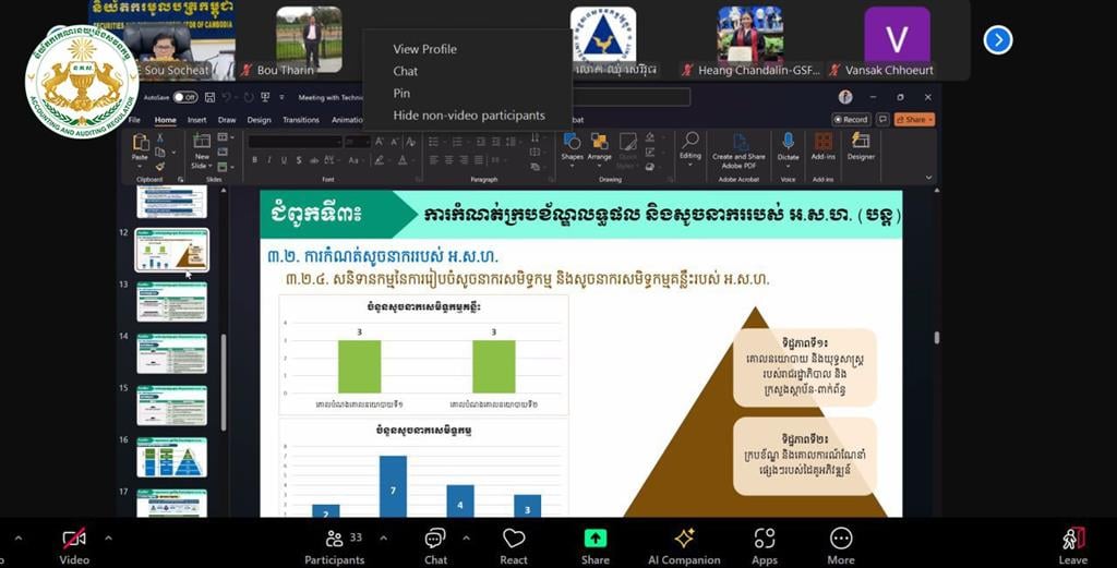 នារសៀលថ្ងៃអង្គារ ៣រោច ខែបុស្ស ឆ្នាំម្សាញ់ សប្តស័ក ព.ស.២៥៦៩ ត្រូវនឹងថ្ងៃទី៦ ខែមករា ឆ្នាំ២០២៦ វេលាម៉ោង១៤:៣០នាទី ឯកឧត្តម ប៊ូ ថារិន អគ្គនាយកនៃនិយ័តករគណនេយ្យនិងសវនកម្ម(ន.គ.ស.) អមដោយថ្នាក់ដឹកនាំ និងមន្ដ្រីជំនាញនៃ ន.គ.ស. បានអញ្ជើញចូលរួម កិច្ចប្រជុំបច្ចេកទេសនៃអង្គភាពក្រោមឱវាទអាជ្ញាធរសេវាហិរញ្ញវត្ថុមិនមែនធនាគារ(អ.ស.ហ.) តាមប្រព័ន្ធសន្និសីទវីដេអូ Zoom ដើម្បីពិនិត្យ និងផ្ដល់យោបល់ទៅលើសេចក្ដីព្រាងដូចខាងក្រោម៖