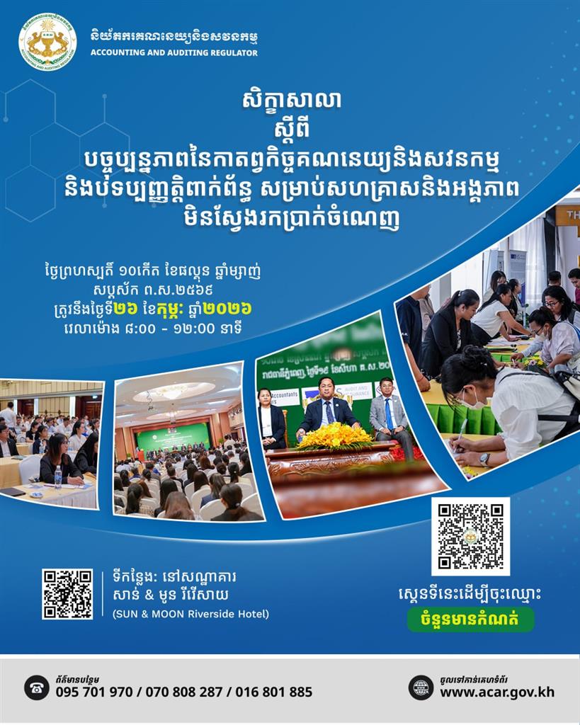 សិក្ខាសាលា ស្តីពី បច្ចុប្បន្នភាពនៃកាតព្វកិច្ចគណនេយ្យនិងសវនកម្ម និងបទប្បញ្ញត្តិពាក់ព័ន្ធ សម្រាប់សហគ្រាសនិងអង្គភាពមិនស្វែងរកប្រាក់ចំណេញ 📅ថ្ងៃទី២៦ ខែកុម្ភះ ឆ្នាំ២០២៦ ⏰ម៉ោង ៨:០០នាទី ព្រឹក ដល់ ១២:០០ នាទី ថ្ងៃត្រង់
