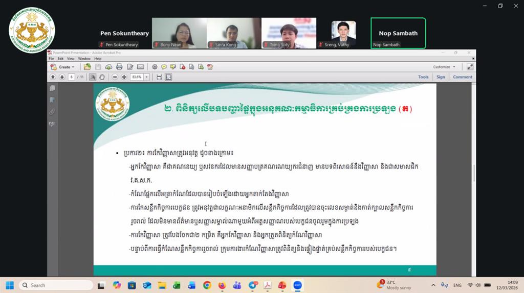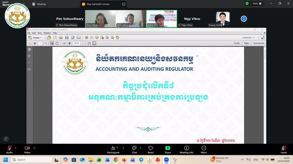 នាព្រឹកថ្ងៃព្រហស្បតិ៍ ៩រោច ខែផល្គុន ឆ្នាំម្សាញ់ សប្តស័ក ព.ស. ២៥៦៩ ត្រូវនឹងថ្ងៃទី១២ ខែមីនា គ.ស. ២០២៦ វេលាម៉ោង ២:០០នាទីរសៀល តាមប្រព័ន្ធអនឡាញ (Zoom) លោកស្រី នាន បូនី អគ្គនាយករងនៃនិយ័តករគណនេយ្យ និងសវនកម្ម និងជាប្រធានអនុគណៈកម្មាធិការគ្រប់គ្រងការប្រឡង បានដឹកនាំ កិច្ចប្រជុំលើកទី៨ របស់អនុគណៈកម្មាធិការគ្រប់គ្រងការប្រឡង នៃគណៈកម្មាធិការគ្រប់គ្រងកម្មវិធីសិក្សាគណនេយ្យករជំនាញកម្ពុជា (គ.ក.គ.ក.) ដោយមានការអញ្ជើញចូលរួមពី លោកអនុប្រធាន សមាជិករបស់អនុគណៈកម្មាធិការគ្រប់គ្រងការប្រឡង និងលេខាធិការដ្ឋាន។
