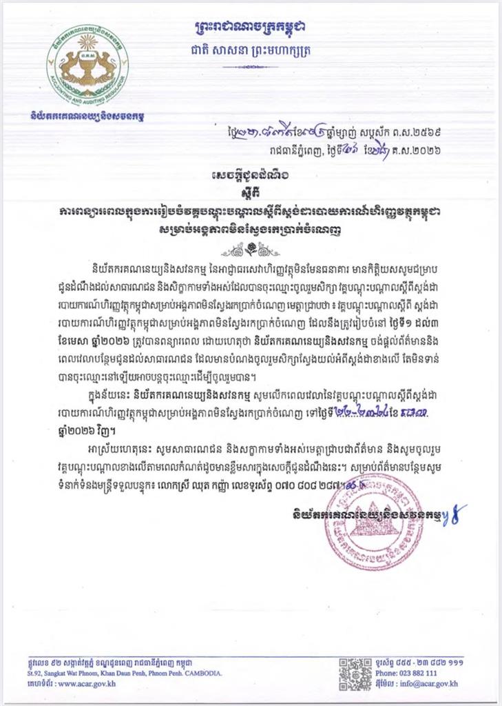ការពន្យាពេលក្នុងការរៀបចំ វគ្គបណ្តុះបណ្តាលស្តីពី ស្តង់ដារបាយការណ៍ហិរញ្ញវត្ថុកម្ពុជា