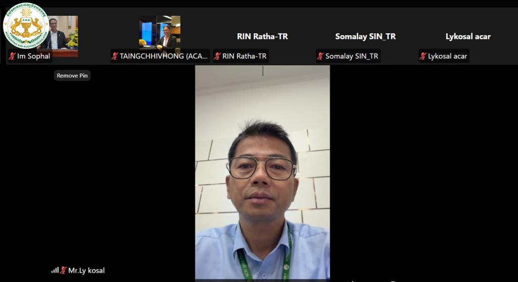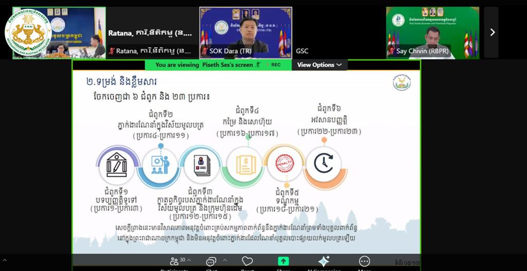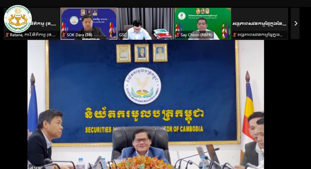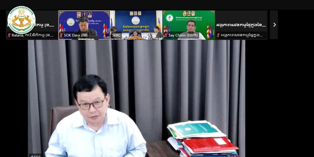 នារសៀលថ្ងៃអង្គារ ១៣កើត ខែចេត្រ ឆ្នាំម្សាញ់ សប្តស័ក ព.ស.២៥៦៩ ត្រូវនឹងថ្ងៃទី៣១ ខែមីនា ឆ្នាំ២០២៦ វេលាម៉ោង ២:៣០នាទី ដោយមានការអនុញ្ញាតដ៏ខ្ពង់ខ្ពស់ពី ឯកឧត្តម ប៊ូ ថារិន អគ្គនាយកនៃនិយ័តករគណនេយ្យនិងសវនកម្ម(ន.គ.ស.) លោក លី កុសល ប្រធាននាយកដ្ឋានកិច្ចការគតិយុត្តនិងអនុលោមភាព និងមន្រ្តីជំនាញ នៃន.គ.ស. បានអញ្ជើញចូលរួមកិច្ចប្រជុំបច្ចេកទេសនៃអង្គភាពក្រោមឱវាទអាជ្ញាធរសេវាហិរញ្ញវត្ថុមិនមែនធនាគារ(អ.ស.ហ.) តាមប្រព័ន្ធសន្និសីទវីដេអូ Zoom ដើម្បីពិភាក្សាលើ “សេចក្ដីព្រាងប្រកាសស្ដីពីការផ្ដល់ការអនុញ្ញាត និងការគ្រប់គ្រងភ្នាក់ងារណែនាំក្នុងវិស័យមូលបត្រ”។ កិច្ចប្រជុំនេះប្រព្រឹត្តទៅក្រោមការដឹកនាំដ៏ខ្ពង់ខ្ពស់របស់ ឯកឧត្តម រស់ សីលវ៉ា រដ្ឋលេខាធិការក្រសួងសេដ្ឋកិច្ចនិងហិរញ្ញវត្ថុ និងជាអនុប្រធានក្រុមប្រឹក្សា អ.ស.ហ. និងថ្នាក់ដឹកនាំនៃអគ្គលេខាធិការដ្ឋាន និយ័តករ និងអង្គភាពក្រោមឱវាទ អ.ស.ហ.។