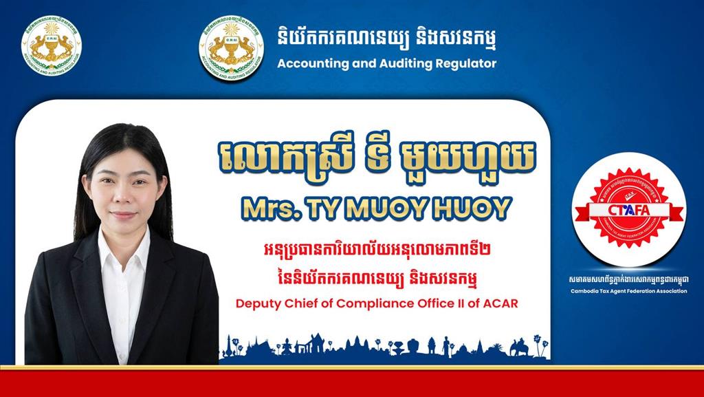 នាព្រឹកថ្ងៃសុក្រ ១រោច ខែចេត្រ ឆ្នាំម្សាញ់ សប្តស័ក ព.ស.២៥៦៩ ត្រូវនឹងថ្ងៃទី៣ ខែមេសា ឆ្នាំ២០២៦ ដោយទទួលបានការអនុញ្ញាតដ៏ខ្ពង់ខ្ពស់ពី ឯកឧត្តម ប៊ូ ថារិន អគ្គនាយកនៃនិយ័តករគណនេយ្យនិងសវនកម្ម លោកស្រី ទី មួយហួយ អនុប្រធានការិយាល័យអនុលោមភាពទី២ បានចូលរួមធ្វើបទបង្ហាញក្នុងសិក្ខាសាលាស្តីពី «នីតិវិធី រៀបចំ និងដាក់បញ្ជូនរបាយការណ៍ហិរញ្ញវត្ថុសម្រាប់សហគ្រាសមិនរងសវនកម្មឯករាជ្យ» ដែលរៀបចំឡើងដោយ សមាគមសហពន្ធ័ភ្នាក់ងារសេវាកម្មពន្ធដារកម្ពុជា (CTAFA) ក្រោមអធិបតីភាពដ៏ខ្ពង់ខ្ពស់របស់ ឯកឧត្តមបណ្ឌិត ទេព សិដ្ឋាន់ណា អនុប្រធានសមាគម និងជាប្រធានគណៈកម្មការប្រឹក្សាយោបល់និងផ្តល់ដំណោះស្រាយ នៃ CTAFA។ សិក្ខាសាលានេះក៏មានការអញ្ជើញចូលរួមពីម្ចាស់សហគ្រាស តំណាងសហគ្រាសដែលជាសមាជិករបស់សមាគម និងសិក្ខាកាមចំនួនប្រមាណ ២០០នាក់ តាមប្រព័ន្ធអនឡាញ (Zoom)។